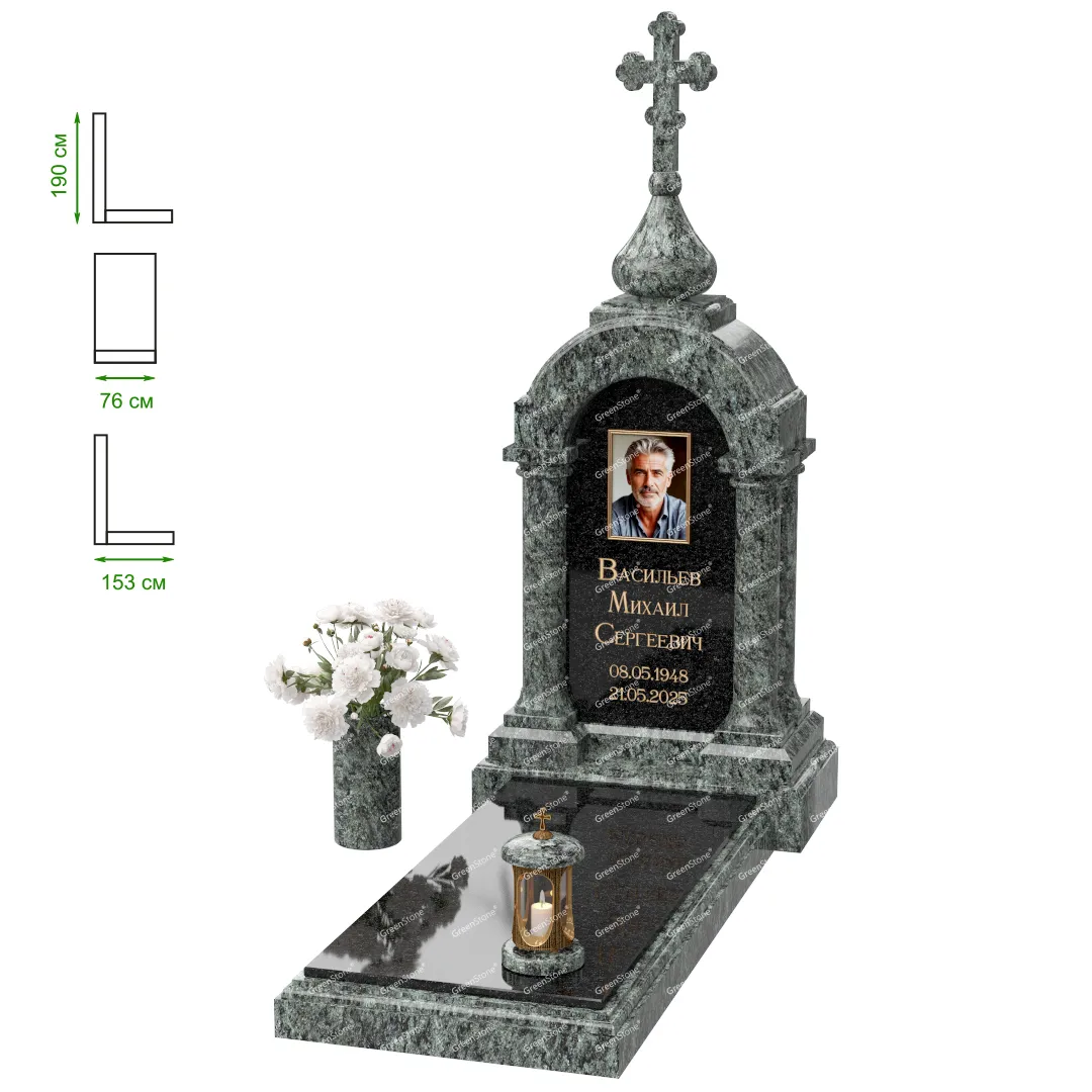Визуально комплекс отличается от типовой формы не только формой, но и размерами. Массивная стела позволяет дизайнеру реализовать практически любые задумки и пожелания Заказчика, придать готовому изделию солидный вид, раскрыть все достоинства использованного в его изготовлении гранита. Такой габаритный памятник требует профессиональной доставки и установки. Все это также можно заказать в мастерской Грин-Стоун.