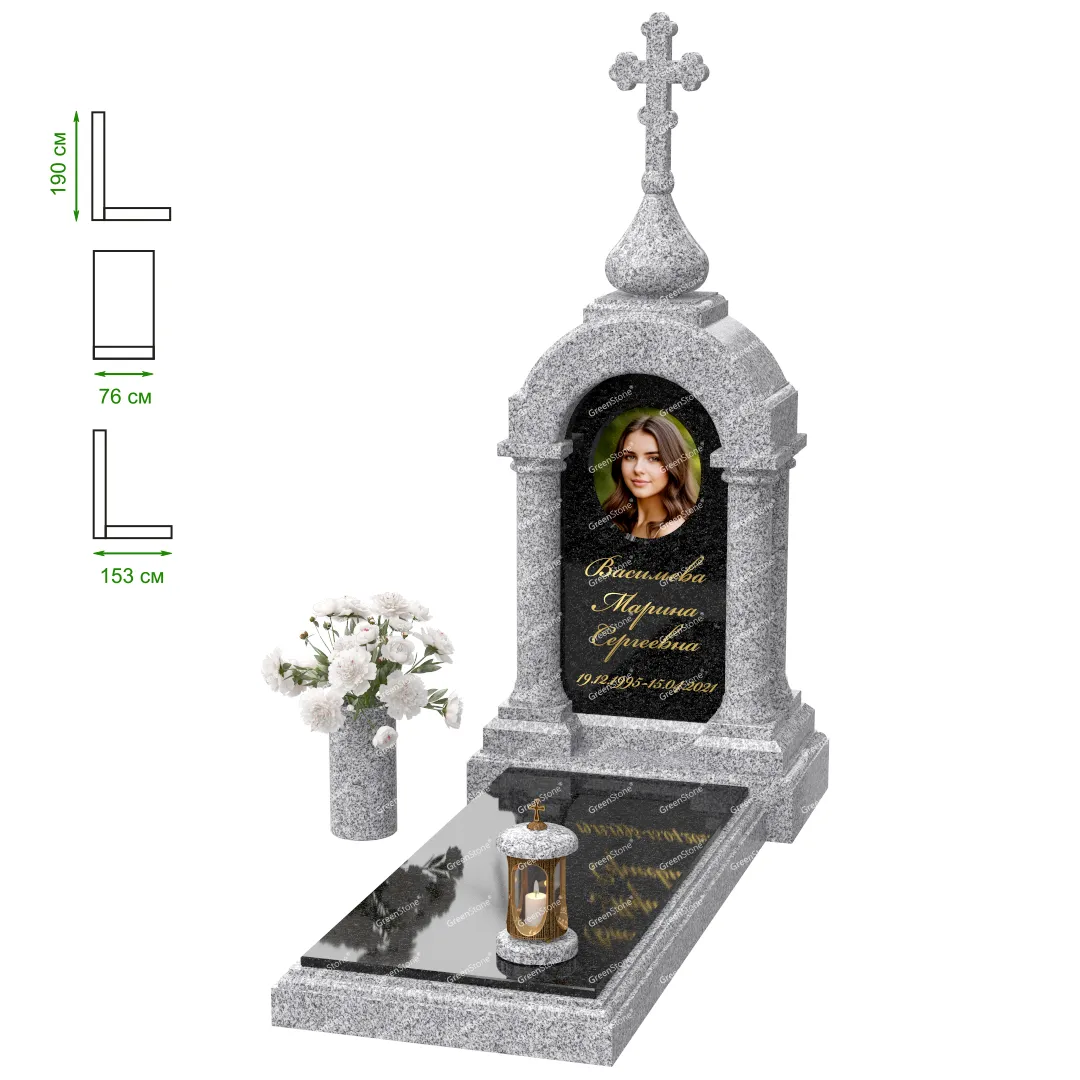 Визуально комплекс отличается от типовой формы не только формой, но и размерами. Массивная стела позволяет дизайнеру реализовать практически любые задумки и пожелания Заказчика, придать готовому изделию солидный вид, раскрыть все достоинства использованного в его изготовлении гранита. Такой габаритный памятник требует профессиональной доставки и установки. Все это также можно заказать в мастерской Грин-Стоун.