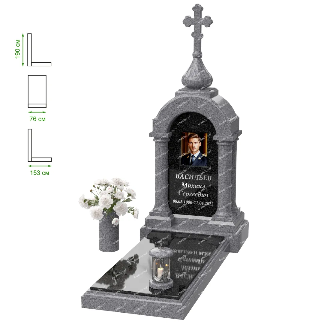 Визуально комплекс отличается от типовой формы не только формой, но и размерами. Массивная стела позволяет дизайнеру реализовать практически любые задумки и пожелания Заказчика, придать готовому изделию солидный вид, раскрыть все достоинства использованного в его изготовлении гранита. Такой габаритный памятник требует профессиональной доставки и установки. Все это также можно заказать в мастерской Грин-Стоун.