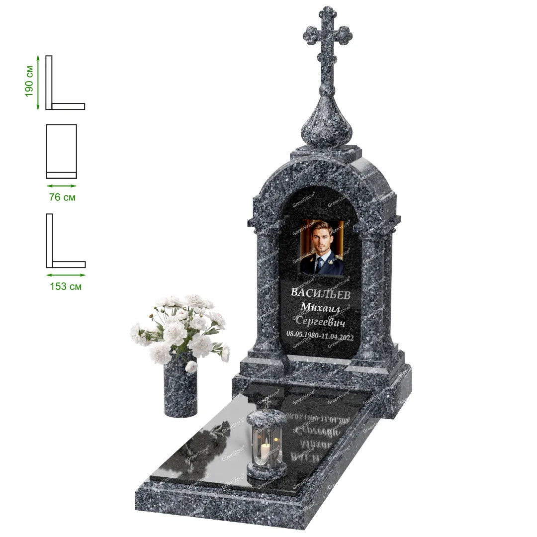 Визуально комплекс отличается от типовой формы не только формой, но и размерами. Массивная стела позволяет дизайнеру реализовать практически любые задумки и пожелания Заказчика, придать готовому изделию солидный вид, раскрыть все достоинства использованного в его изготовлении гранита. Такой габаритный памятник требует профессиональной доставки и установки. Все это также можно заказать в мастерской Грин-Стоун.