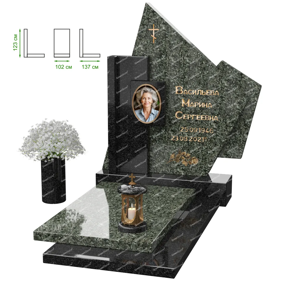 Визуально комплекс отличается от типовой формы не только формой, но и размерами. Массивная стела позволяет дизайнеру реализовать практически любые задумки и пожелания Заказчика, придать готовому изделию солидный вид, раскрыть все достоинства использованного в его изготовлении гранита. Такой габаритный памятник требует профессиональной доставки и установки. Все это также можно заказать в мастерской Грин-Стоун.