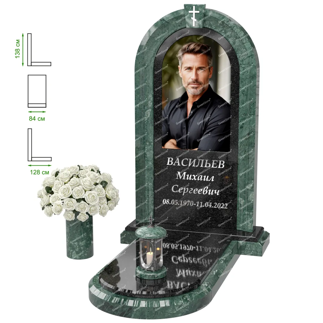 Визуально комплекс отличается от типовой формы не только формой, но и размерами. Массивная стела позволяет дизайнеру реализовать практически любые задумки и пожелания Заказчика, придать готовому изделию солидный вид, раскрыть все достоинства использованного в его изготовлении гранита. Такой габаритный памятник требует профессиональной доставки и установки. Все это также можно заказать в мастерской Грин-Стоун.