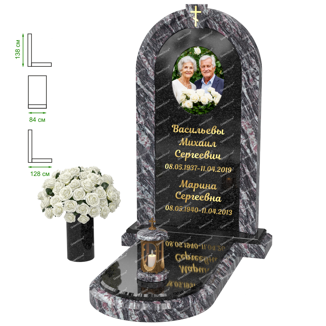 Визуально комплекс отличается от типовой формы не только формой, но и размерами. Массивная стела позволяет дизайнеру реализовать практически любые задумки и пожелания Заказчика, придать готовому изделию солидный вид, раскрыть все достоинства использованного в его изготовлении гранита. Такой габаритный памятник требует профессиональной доставки и установки. Все это также можно заказать в мастерской Грин-Стоун.