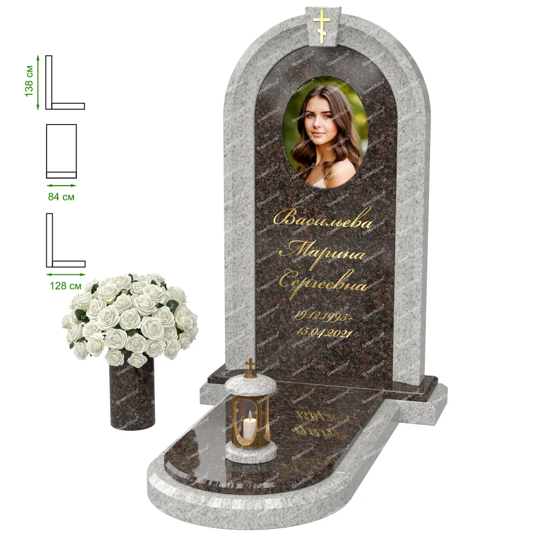 Визуально комплекс отличается от типовой формы не только формой, но и размерами. Массивная стела позволяет дизайнеру реализовать практически любые задумки и пожелания Заказчика, придать готовому изделию солидный вид, раскрыть все достоинства использованного в его изготовлении гранита. Такой габаритный памятник требует профессиональной доставки и установки. Все это также можно заказать в мастерской Грин-Стоун.