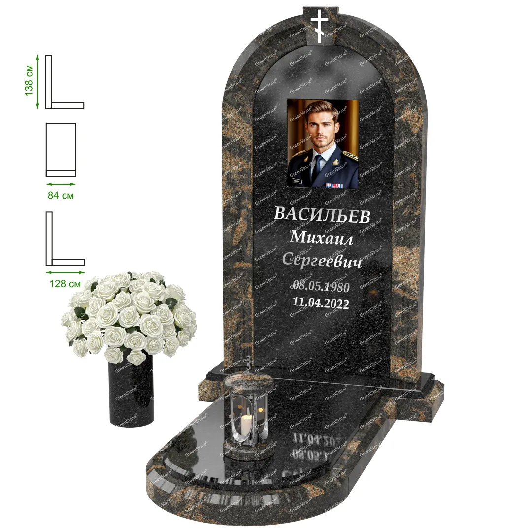 Визуально комплекс отличается от типовой формы не только формой, но и размерами. Массивная стела позволяет дизайнеру реализовать практически любые задумки и пожелания Заказчика, придать готовому изделию солидный вид, раскрыть все достоинства использованного в его изготовлении гранита. Такой габаритный памятник требует профессиональной доставки и установки. Все это также можно заказать в мастерской Грин-Стоун.