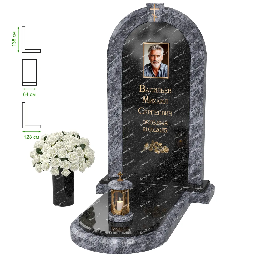 Визуально комплекс отличается от типовой формы не только формой, но и размерами. Массивная стела позволяет дизайнеру реализовать практически любые задумки и пожелания Заказчика, придать готовому изделию солидный вид, раскрыть все достоинства использованного в его изготовлении гранита. Такой габаритный памятник требует профессиональной доставки и установки. Все это также можно заказать в мастерской Грин-Стоун.