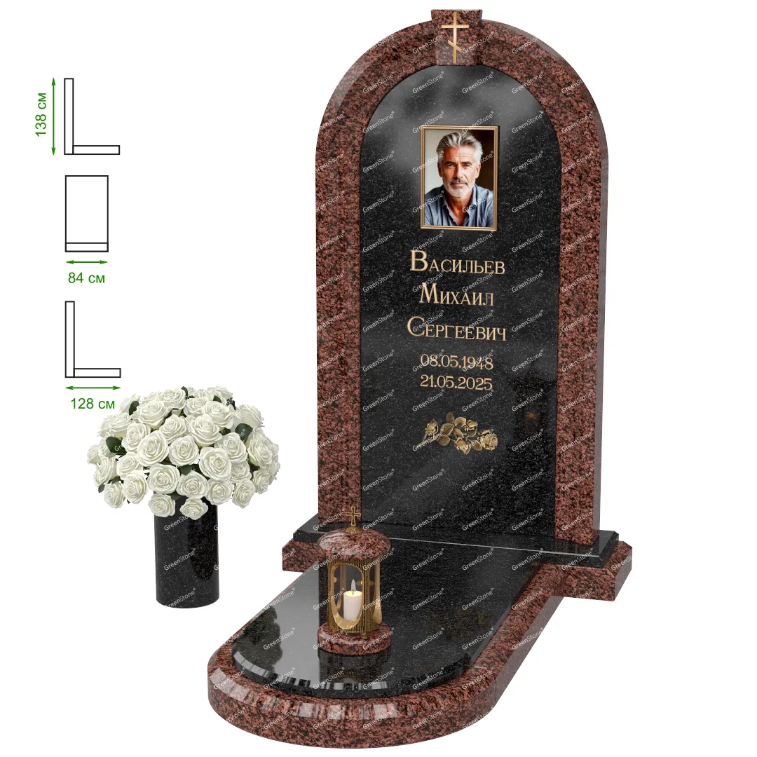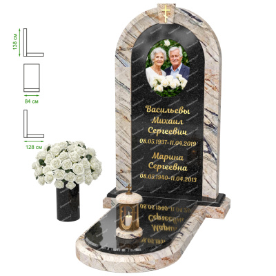 Визуально комплекс отличается от типовой формы не только формой, но и размерами. Массивная стела позволяет дизайнеру реализовать практически любые задумки и пожелания Заказчика, придать готовому изделию солидный вид, раскрыть все достоинства использованного в его изготовлении гранита. Такой габаритный памятник требует профессиональной доставки и установки. Все это также можно заказать в мастерской Грин-Стоун.