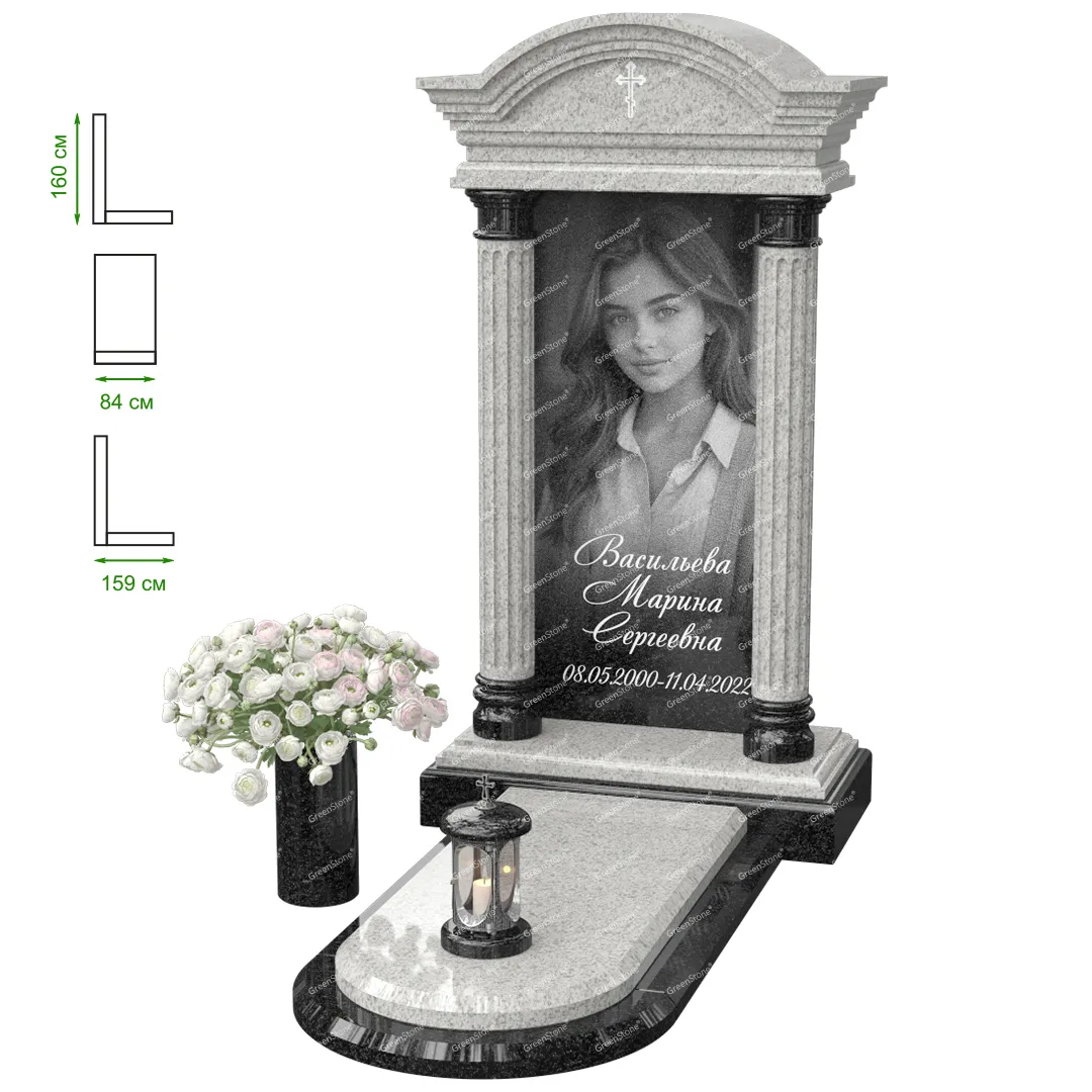 Визуально комплекс отличается от типовой формы не только формой, но и размерами. Массивная стела позволяет дизайнеру реализовать практически любые задумки и пожелания Заказчика, придать готовому изделию солидный вид, раскрыть все достоинства использованного в его изготовлении гранита. Такой габаритный памятник требует профессиональной доставки и установки. Все это также можно заказать в мастерской Грин-Стоун.