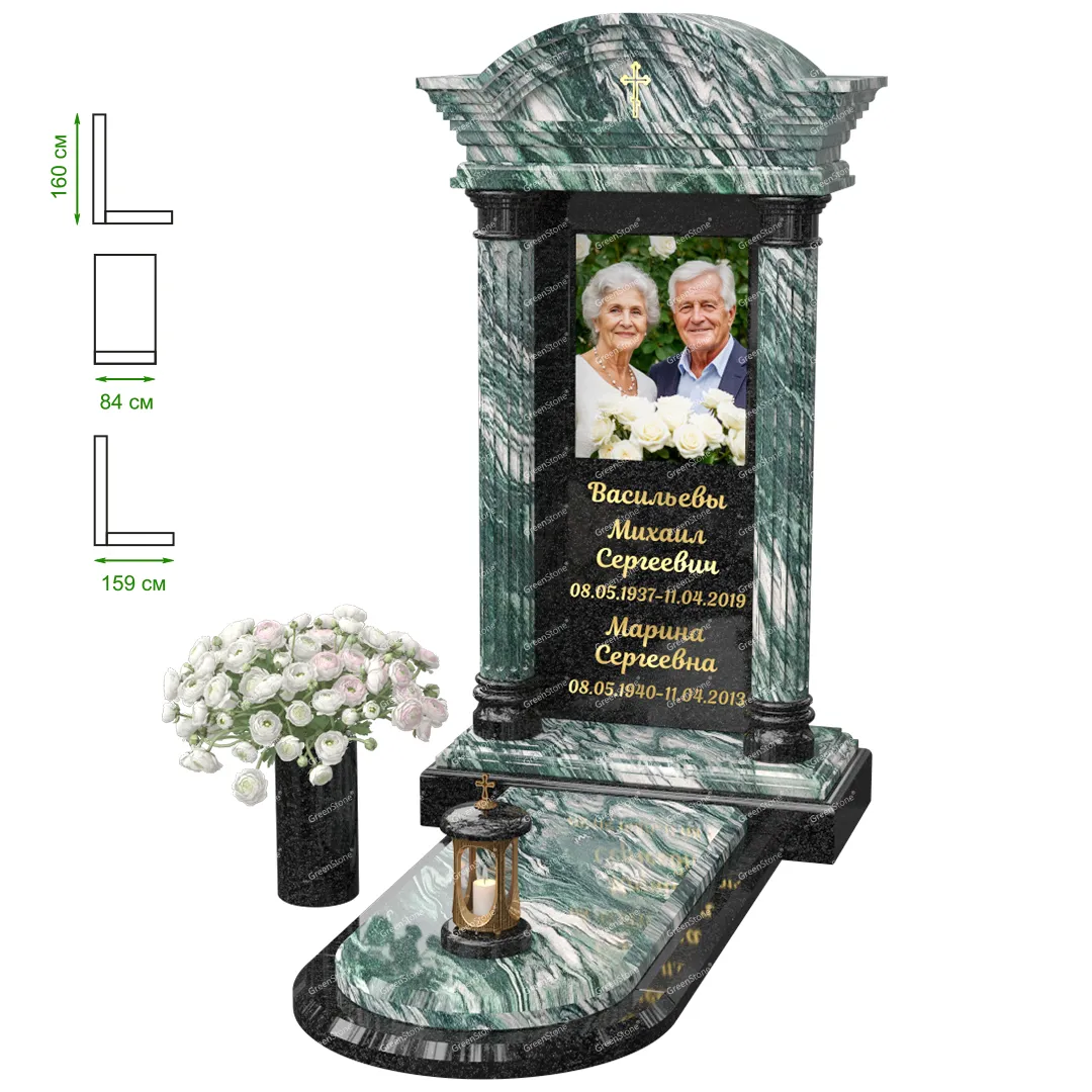 Визуально комплекс отличается от типовой формы не только формой, но и размерами. Массивная стела позволяет дизайнеру реализовать практически любые задумки и пожелания Заказчика, придать готовому изделию солидный вид, раскрыть все достоинства использованного в его изготовлении гранита. Такой габаритный памятник требует профессиональной доставки и установки. Все это также можно заказать в мастерской Грин-Стоун.