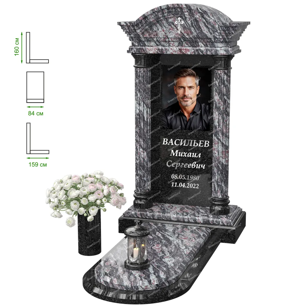 Визуально комплекс отличается от типовой формы не только формой, но и размерами. Массивная стела позволяет дизайнеру реализовать практически любые задумки и пожелания Заказчика, придать готовому изделию солидный вид, раскрыть все достоинства использованного в его изготовлении гранита. Такой габаритный памятник требует профессиональной доставки и установки. Все это также можно заказать в мастерской Грин-Стоун.