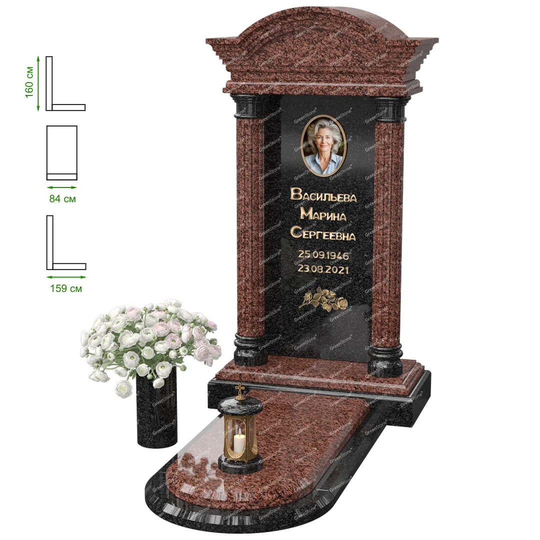 Визуально комплекс отличается от типовой формы не только формой, но и размерами. Массивная стела позволяет дизайнеру реализовать практически любые задумки и пожелания Заказчика, придать готовому изделию солидный вид, раскрыть все достоинства использованного в его изготовлении гранита. Такой габаритный памятник требует профессиональной доставки и установки. Все это также можно заказать в мастерской Грин-Стоун.