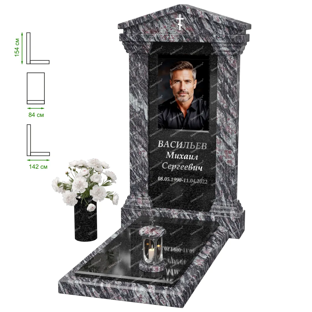 Визуально комплекс отличается от типовой формы не только формой, но и размерами. Массивная стела позволяет дизайнеру реализовать практически любые задумки и пожелания Заказчика, придать готовому изделию солидный вид, раскрыть все достоинства использованного в его изготовлении гранита. Такой габаритный памятник требует профессиональной доставки и установки. Все это также можно заказать в мастерской Грин-Стоун.