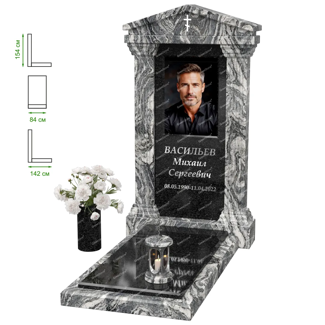 Визуально комплекс отличается от типовой формы не только формой, но и размерами. Массивная стела позволяет дизайнеру реализовать практически любые задумки и пожелания Заказчика, придать готовому изделию солидный вид, раскрыть все достоинства использованного в его изготовлении гранита. Такой габаритный памятник требует профессиональной доставки и установки. Все это также можно заказать в мастерской Грин-Стоун.