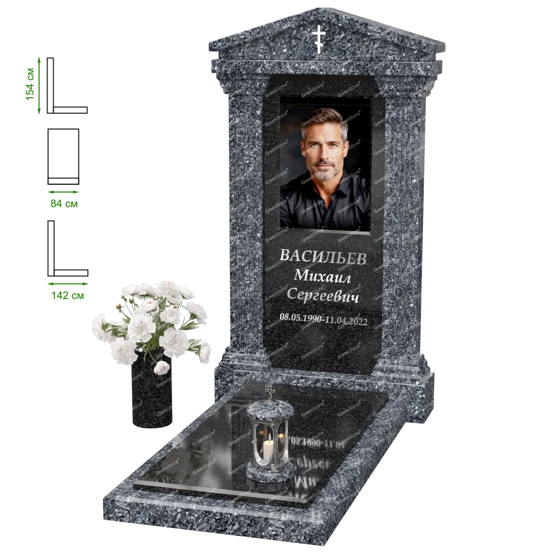 Визуально комплекс отличается от типовой формы не только формой, но и размерами. Массивная стела позволяет дизайнеру реализовать практически любые задумки и пожелания Заказчика, придать готовому изделию солидный вид, раскрыть все достоинства использованного в его изготовлении гранита. Такой габаритный памятник требует профессиональной доставки и установки. Все это также можно заказать в мастерской Грин-Стоун.