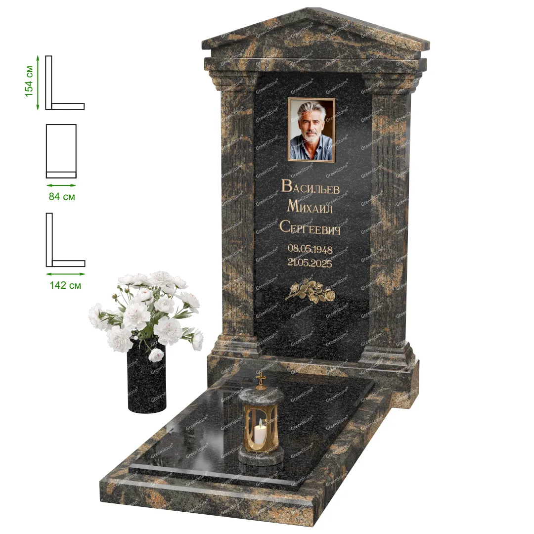 Визуально комплекс отличается от типовой формы не только формой, но и размерами. Массивная стела позволяет дизайнеру реализовать практически любые задумки и пожелания Заказчика, придать готовому изделию солидный вид, раскрыть все достоинства использованного в его изготовлении гранита. Такой габаритный памятник требует профессиональной доставки и установки. Все это также можно заказать в мастерской Грин-Стоун.