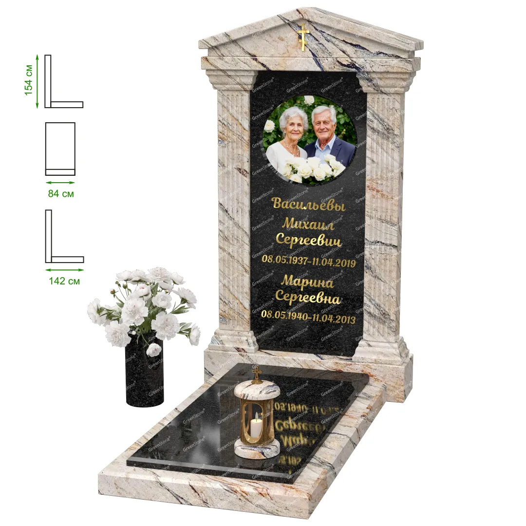Визуально комплекс отличается от типовой формы не только формой, но и размерами. Массивная стела позволяет дизайнеру реализовать практически любые задумки и пожелания Заказчика, придать готовому изделию солидный вид, раскрыть все достоинства использованного в его изготовлении гранита. Такой габаритный памятник требует профессиональной доставки и установки. Все это также можно заказать в мастерской Грин-Стоун.