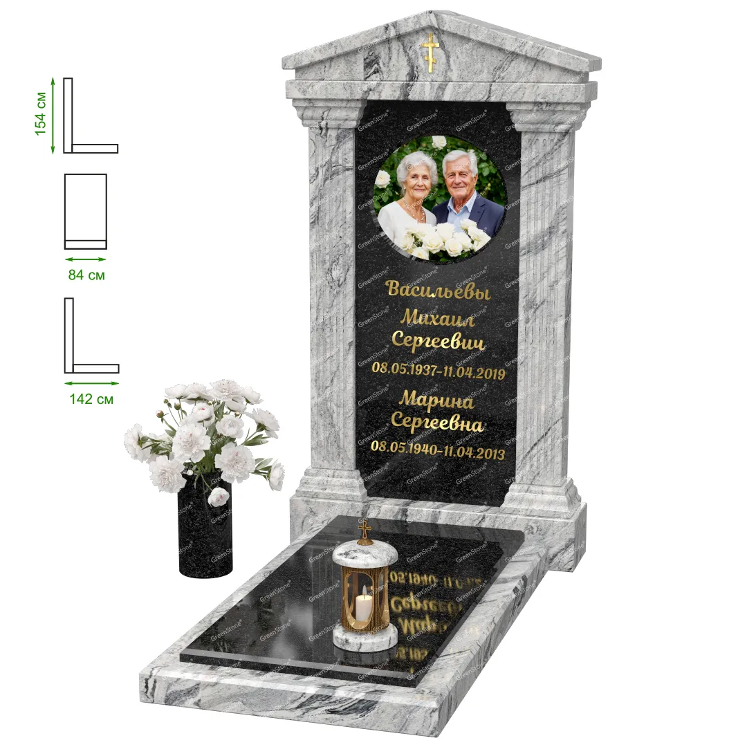 Визуально комплекс отличается от типовой формы не только формой, но и размерами. Массивная стела позволяет дизайнеру реализовать практически любые задумки и пожелания Заказчика, придать готовому изделию солидный вид, раскрыть все достоинства использованного в его изготовлении гранита. Такой габаритный памятник требует профессиональной доставки и установки. Все это также можно заказать в мастерской Грин-Стоун.