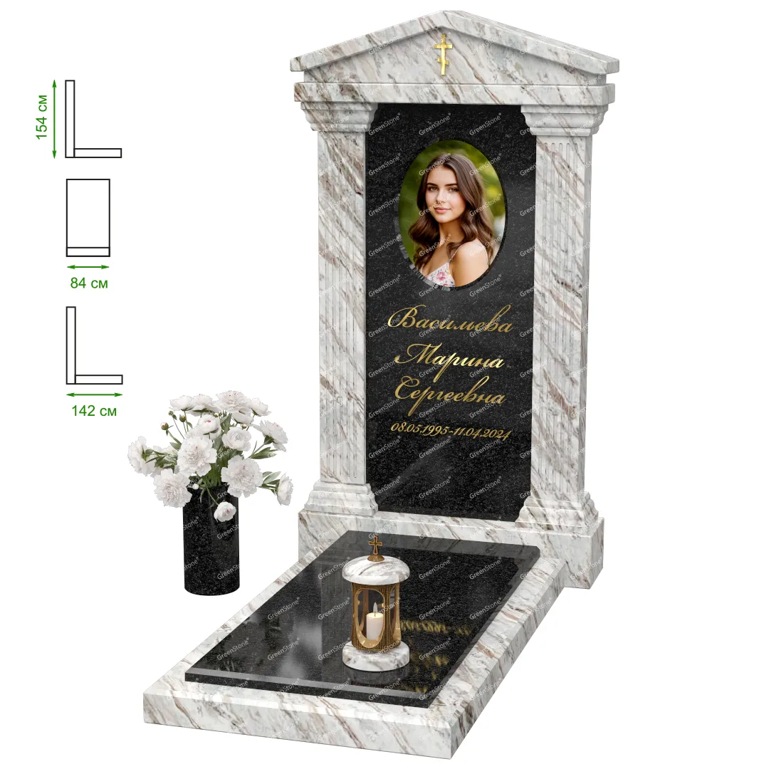 Визуально комплекс отличается от типовой формы не только формой, но и размерами. Массивная стела позволяет дизайнеру реализовать практически любые задумки и пожелания Заказчика, придать готовому изделию солидный вид, раскрыть все достоинства использованного в его изготовлении гранита. Такой габаритный памятник требует профессиональной доставки и установки. Все это также можно заказать в мастерской Грин-Стоун.