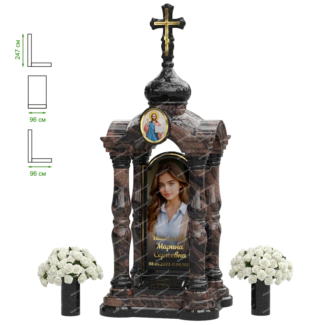 Визуально комплекс отличается от типовой формы не только формой, но и размерами. Массивная стела позволяет дизайнеру реализовать практически любые задумки и пожелания Заказчика, придать готовому изделию солидный вид, раскрыть все достоинства использованного в его изготовлении гранита. Такой габаритный памятник требует профессиональной доставки и установки. Все это также можно заказать в мастерской Грин-Стоун.