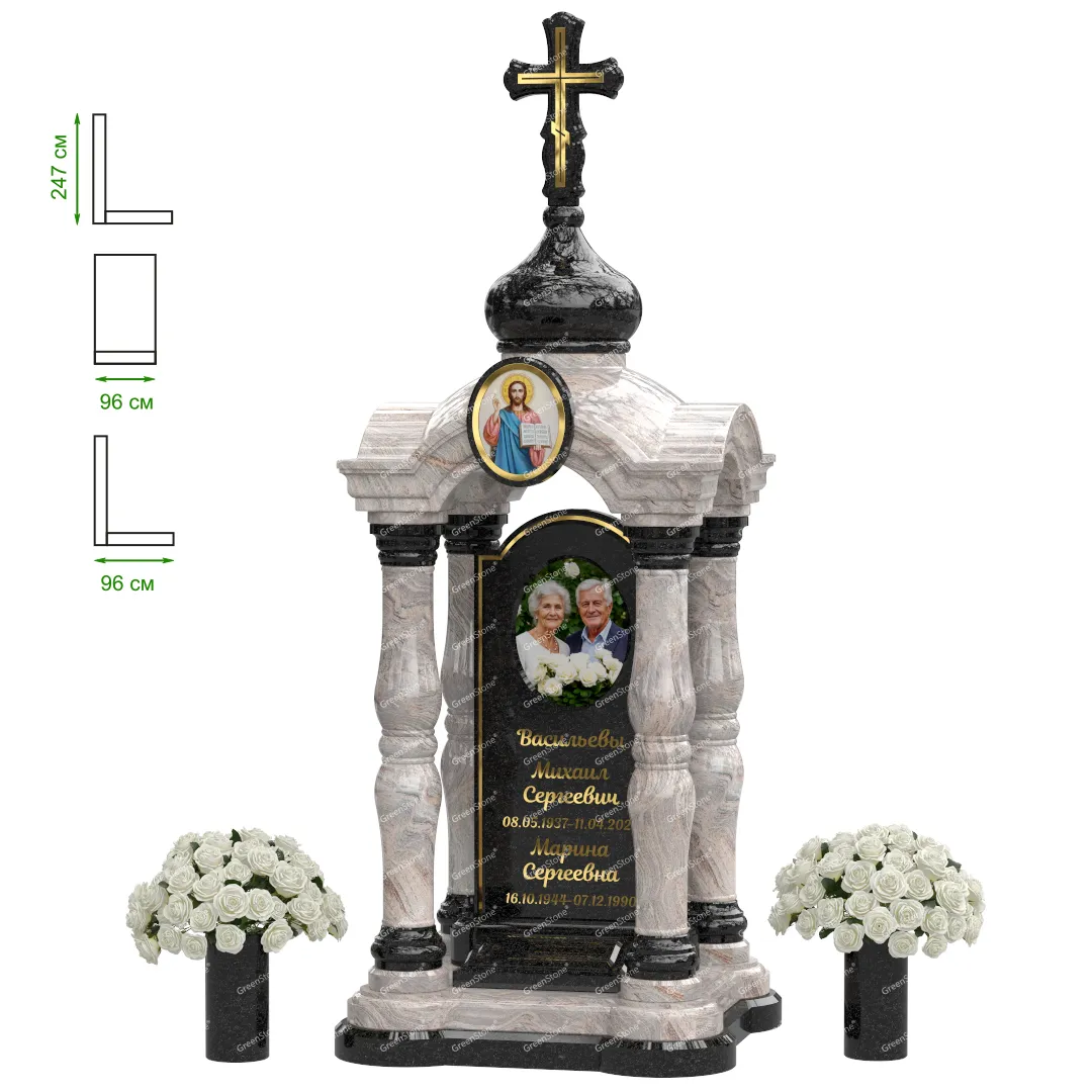 Визуально комплекс отличается от типовой формы не только формой, но и размерами. Массивная стела позволяет дизайнеру реализовать практически любые задумки и пожелания Заказчика, придать готовому изделию солидный вид, раскрыть все достоинства использованного в его изготовлении гранита. Такой габаритный памятник требует профессиональной доставки и установки. Все это также можно заказать в мастерской Грин-Стоун.