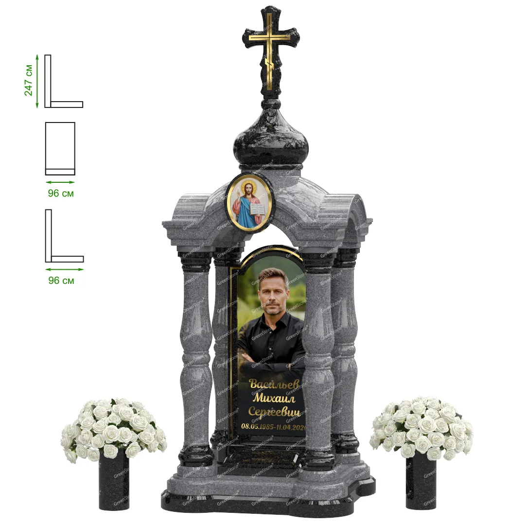 Визуально комплекс отличается от типовой формы не только формой, но и размерами. Массивная стела позволяет дизайнеру реализовать практически любые задумки и пожелания Заказчика, придать готовому изделию солидный вид, раскрыть все достоинства использованного в его изготовлении гранита. Такой габаритный памятник требует профессиональной доставки и установки. Все это также можно заказать в мастерской Грин-Стоун.