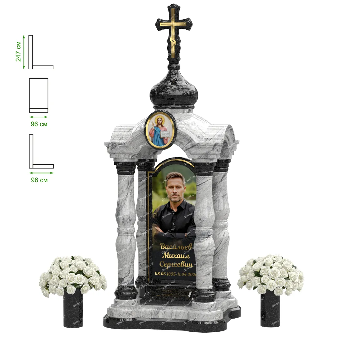 Визуально комплекс отличается от типовой формы не только формой, но и размерами. Массивная стела позволяет дизайнеру реализовать практически любые задумки и пожелания Заказчика, придать готовому изделию солидный вид, раскрыть все достоинства использованного в его изготовлении гранита. Такой габаритный памятник требует профессиональной доставки и установки. Все это также можно заказать в мастерской Грин-Стоун.