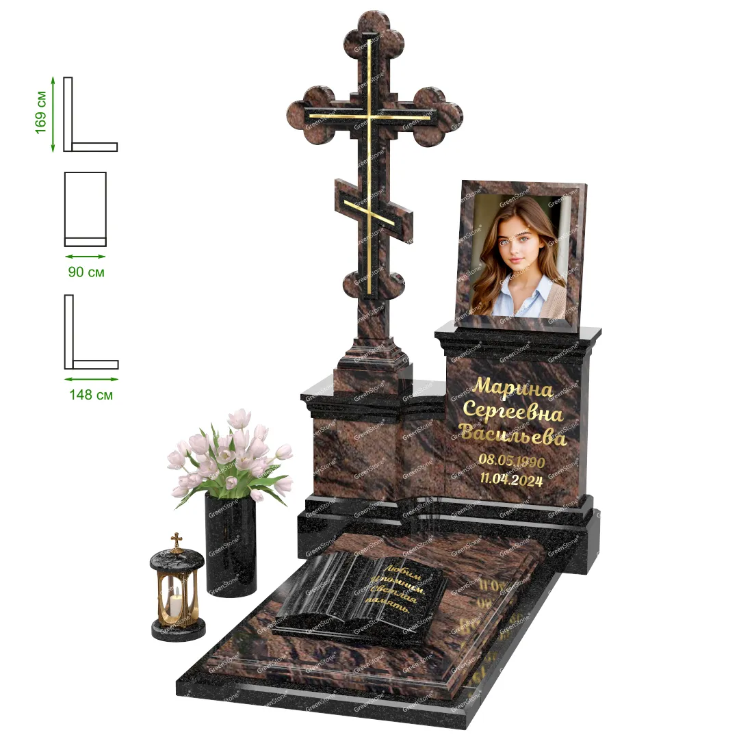 Визуально комплекс отличается от типовой формы не только формой, но и размерами. Массивная стела позволяет дизайнеру реализовать практически любые задумки и пожелания Заказчика, придать готовому изделию солидный вид, раскрыть все достоинства использованного в его изготовлении гранита. Такой габаритный памятник требует профессиональной доставки и установки. Все это также можно заказать в мастерской Грин-Стоун.