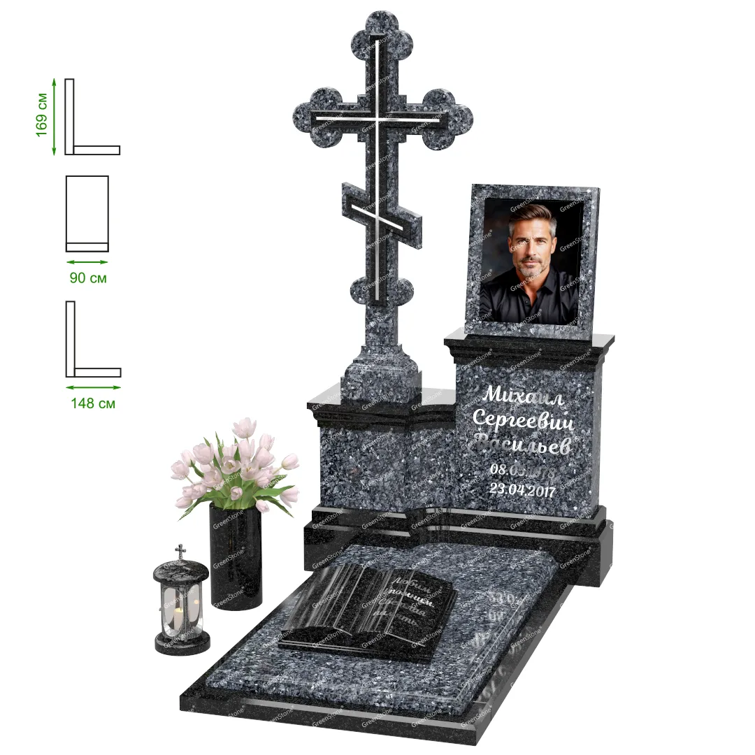 Визуально комплекс отличается от типовой формы не только формой, но и размерами. Массивная стела позволяет дизайнеру реализовать практически любые задумки и пожелания Заказчика, придать готовому изделию солидный вид, раскрыть все достоинства использованного в его изготовлении гранита. Такой габаритный памятник требует профессиональной доставки и установки. Все это также можно заказать в мастерской Грин-Стоун.