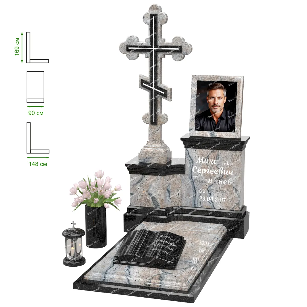 Визуально комплекс отличается от типовой формы не только формой, но и размерами. Массивная стела позволяет дизайнеру реализовать практически любые задумки и пожелания Заказчика, придать готовому изделию солидный вид, раскрыть все достоинства использованного в его изготовлении гранита. Такой габаритный памятник требует профессиональной доставки и установки. Все это также можно заказать в мастерской Грин-Стоун.