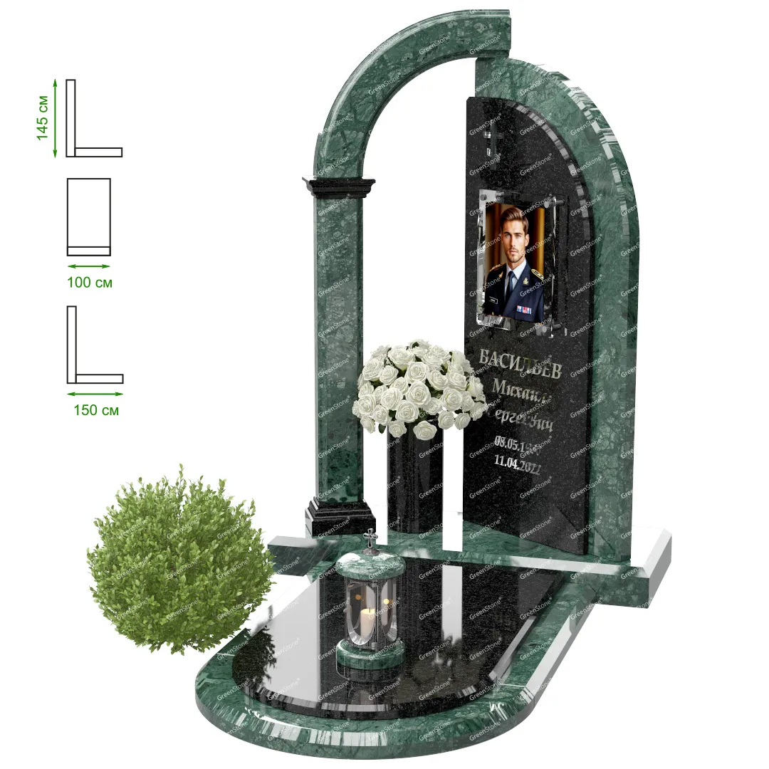 Визуально комплекс отличается от типовой формы не только формой, но и размерами. Массивная стела позволяет дизайнеру реализовать практически любые задумки и пожелания Заказчика, придать готовому изделию солидный вид, раскрыть все достоинства использованного в его изготовлении гранита. Такой габаритный памятник требует профессиональной доставки и установки. Все это также можно заказать в мастерской Грин-Стоун.