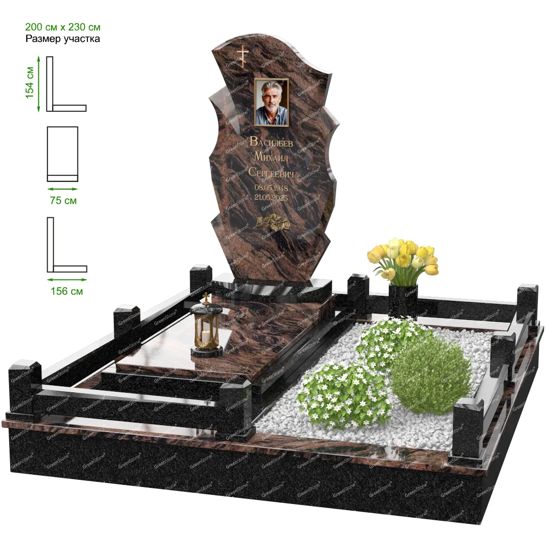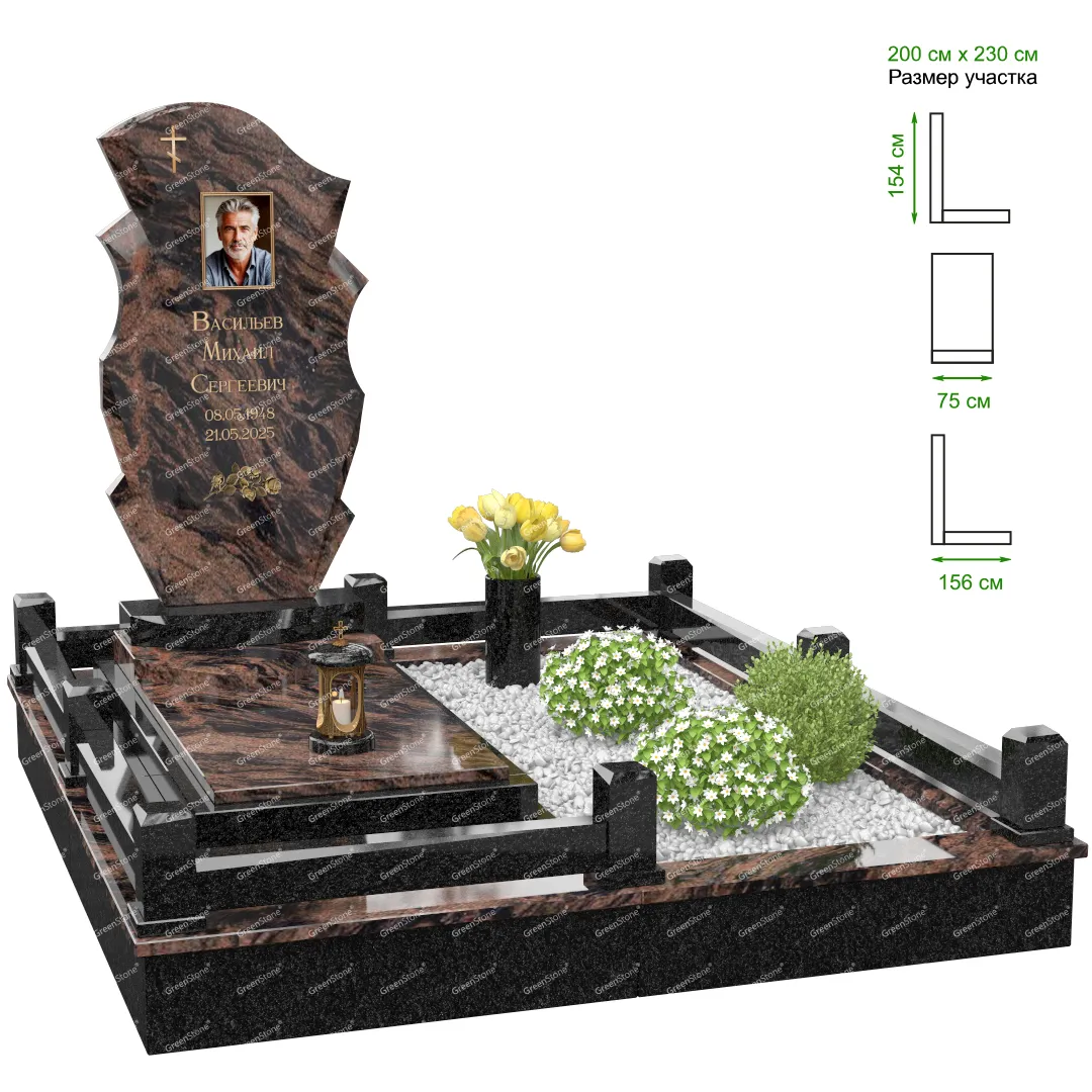 Визуально комплекс отличается от типовой формы не только формой, но и размерами. Массивная стела позволяет дизайнеру реализовать практически любые задумки и пожелания Заказчика, придать готовому изделию солидный вид, раскрыть все достоинства использованного в его изготовлении гранита. Такой габаритный памятник требует профессиональной доставки и установки. Все это также можно заказать в мастерской Грин-Стоун.