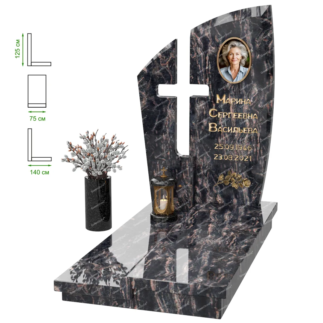 Визуально комплекс отличается от типовой формы не только формой, но и размерами. Массивная стела позволяет дизайнеру реализовать практически любые задумки и пожелания Заказчика, придать готовому изделию солидный вид, раскрыть все достоинства использованного в его изготовлении гранита. Такой габаритный памятник требует профессиональной доставки и установки. Все это также можно заказать в мастерской Грин-Стоун.