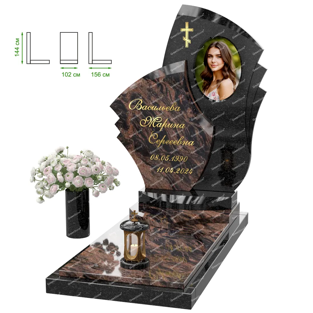 Визуально комплекс отличается от типовой формы не только формой, но и размерами. Массивная стела позволяет дизайнеру реализовать практически любые задумки и пожелания Заказчика, придать готовому изделию солидный вид, раскрыть все достоинства использованного в его изготовлении гранита. Такой габаритный памятник требует профессиональной доставки и установки. Все это также можно заказать в мастерской Грин-Стоун.