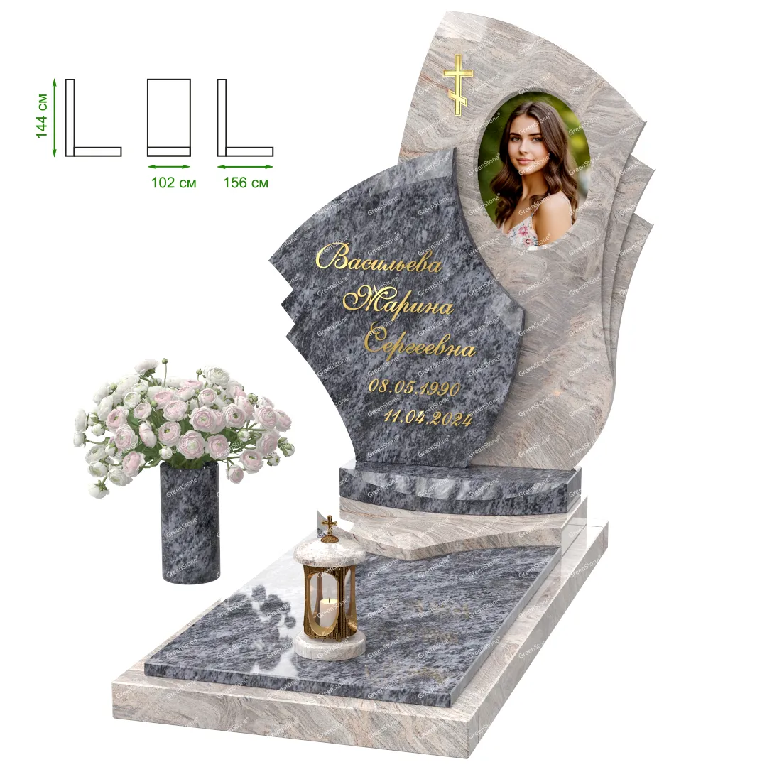 Визуально комплекс отличается от типовой формы не только формой, но и размерами. Массивная стела позволяет дизайнеру реализовать практически любые задумки и пожелания Заказчика, придать готовому изделию солидный вид, раскрыть все достоинства использованного в его изготовлении гранита. Такой габаритный памятник требует профессиональной доставки и установки. Все это также можно заказать в мастерской Грин-Стоун.
