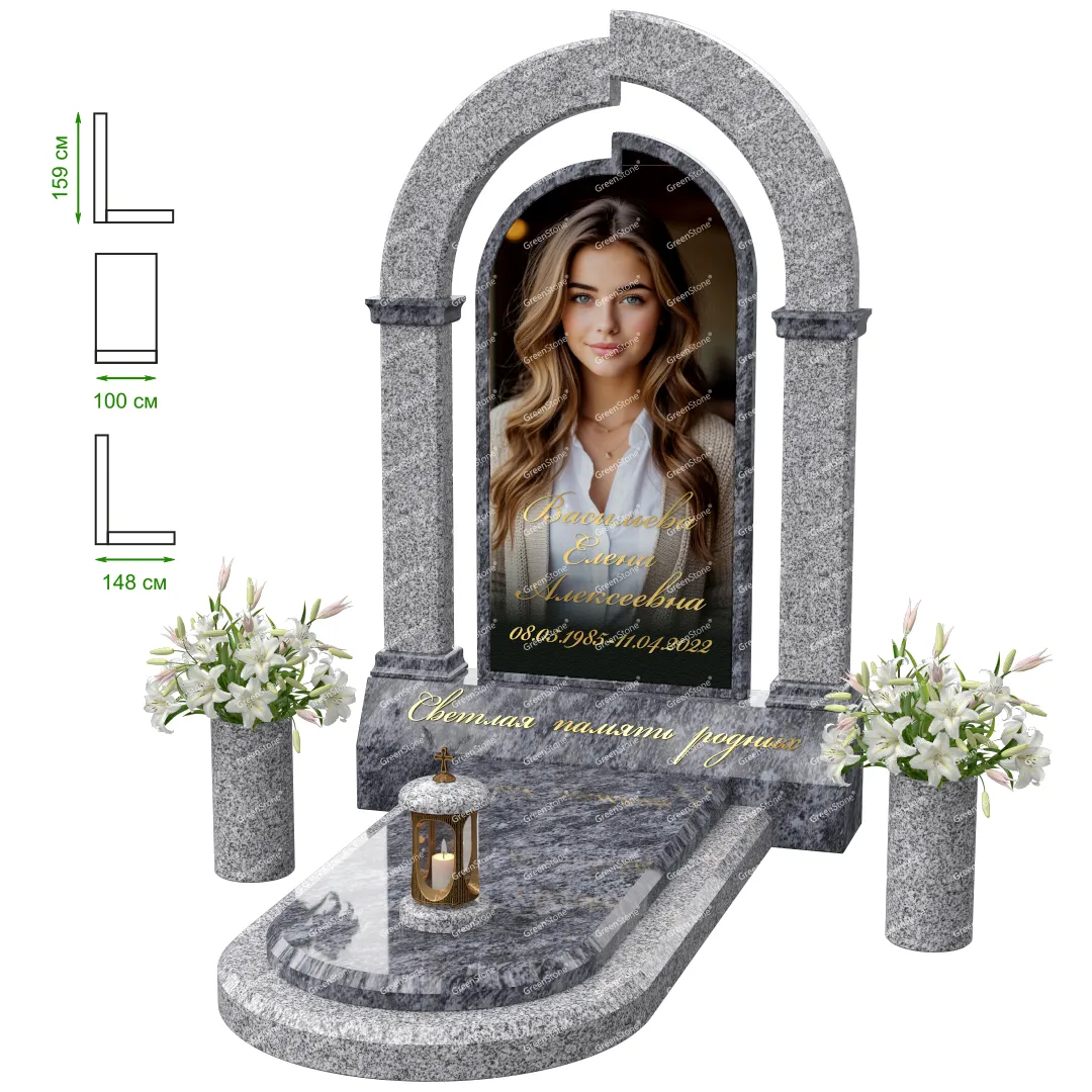 Визуально комплекс отличается от типовой формы не только формой, но и размерами. Массивная стела позволяет дизайнеру реализовать практически любые задумки и пожелания Заказчика, придать готовому изделию солидный вид, раскрыть все достоинства использованного в его изготовлении гранита. Такой габаритный памятник требует профессиональной доставки и установки. Все это также можно заказать в мастерской Грин-Стоун.