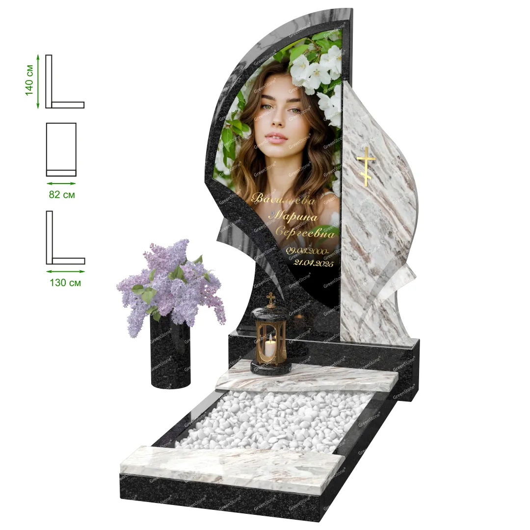 Визуально комплекс отличается от типовой формы не только формой, но и размерами. Массивная стела позволяет дизайнеру реализовать практически любые задумки и пожелания Заказчика, придать готовому изделию солидный вид, раскрыть все достоинства использованного в его изготовлении гранита. Такой габаритный памятник требует профессиональной доставки и установки. Все это также можно заказать в мастерской Грин-Стоун.
