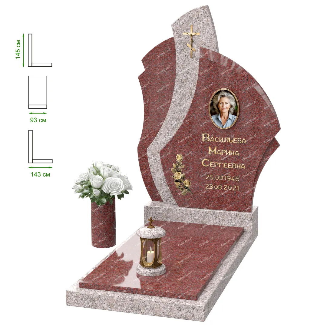 Визуально комплекс отличается от типовой формы не только формой, но и размерами. Массивная стела позволяет дизайнеру реализовать практически любые задумки и пожелания Заказчика, придать готовому изделию солидный вид, раскрыть все достоинства использованного в его изготовлении гранита. Такой габаритный памятник требует профессиональной доставки и установки. Все это также можно заказать в мастерской Грин-Стоун.