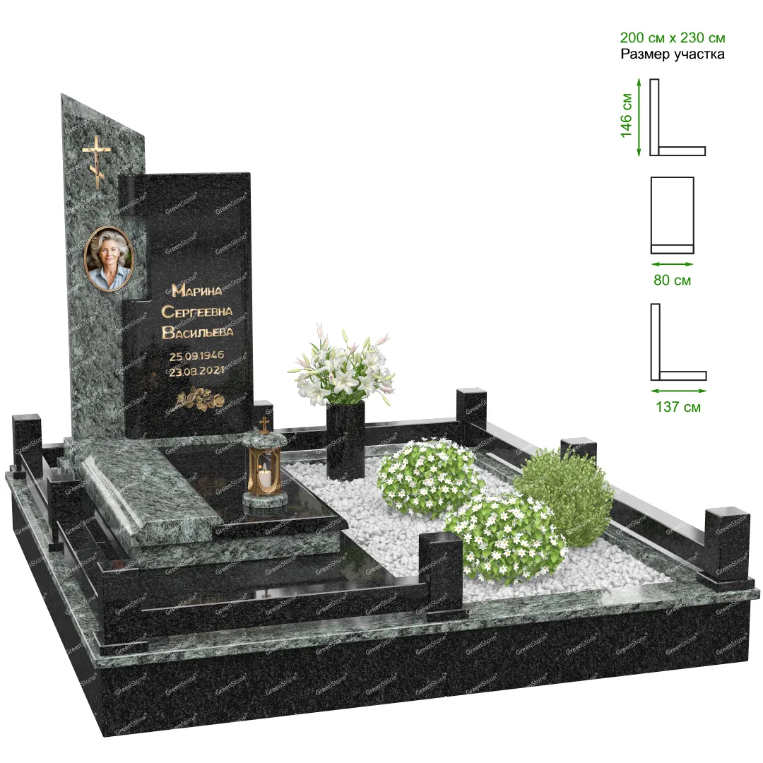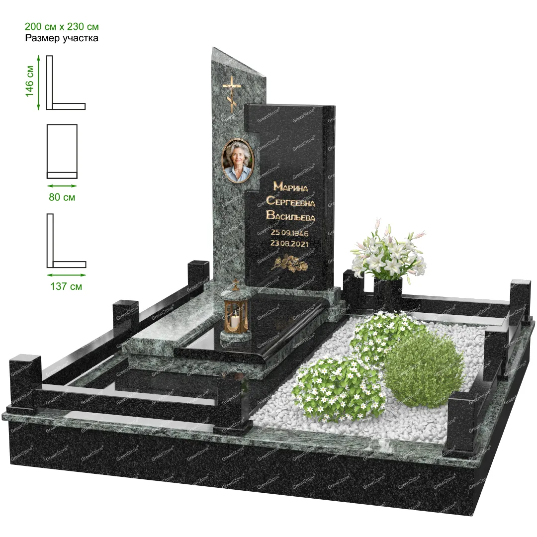 Визуально комплекс отличается от типовой формы не только формой, но и размерами. Массивная стела позволяет дизайнеру реализовать практически любые задумки и пожелания Заказчика, придать готовому изделию солидный вид, раскрыть все достоинства использованного в его изготовлении гранита. Такой габаритный памятник требует профессиональной доставки и установки. Все это также можно заказать в мастерской Грин-Стоун.