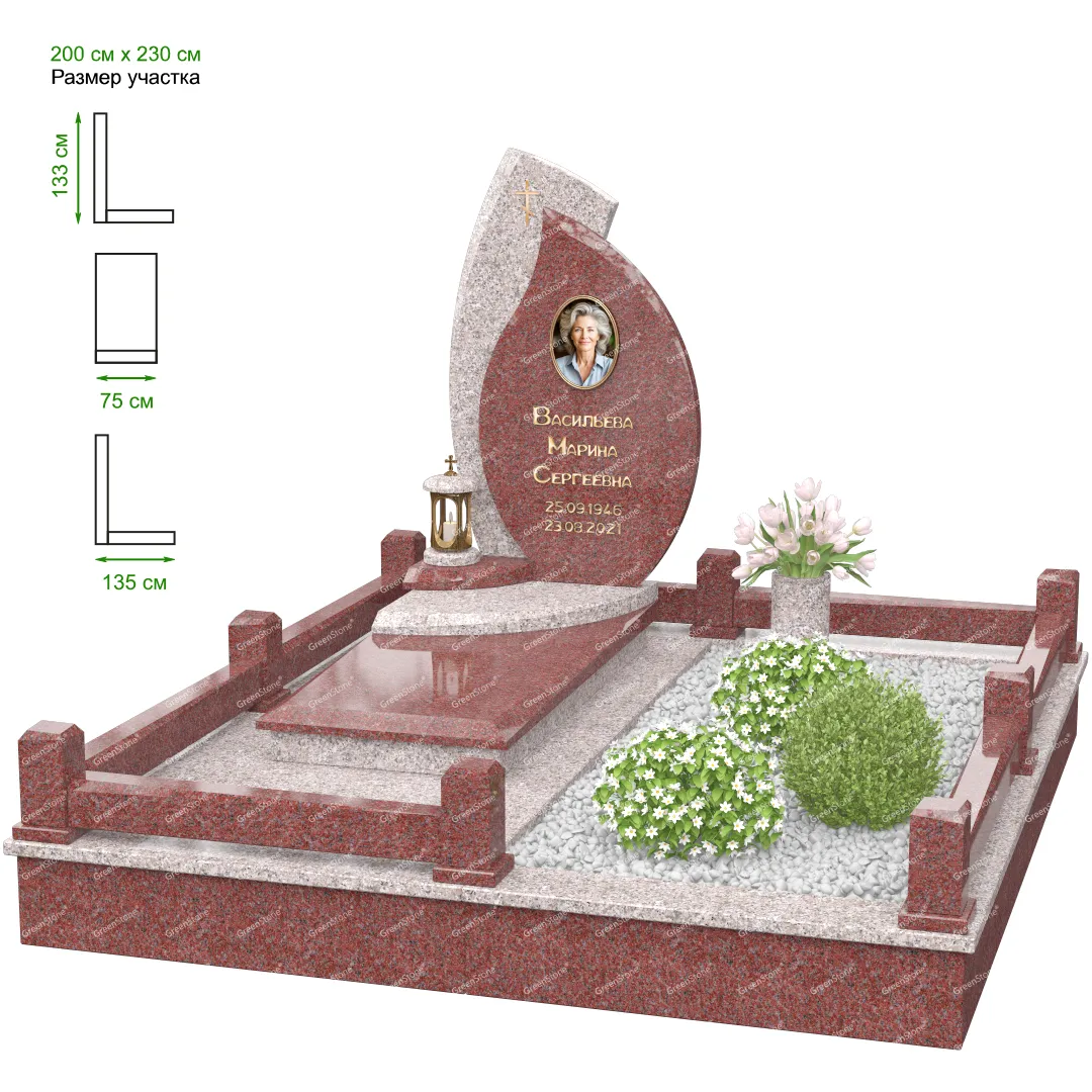 Визуально комплекс отличается от типовой формы не только формой, но и размерами. Массивная стела позволяет дизайнеру реализовать практически любые задумки и пожелания Заказчика, придать готовому изделию солидный вид, раскрыть все достоинства использованного в его изготовлении гранита. Такой габаритный памятник требует профессиональной доставки и установки. Все это также можно заказать в мастерской Грин-Стоун.
