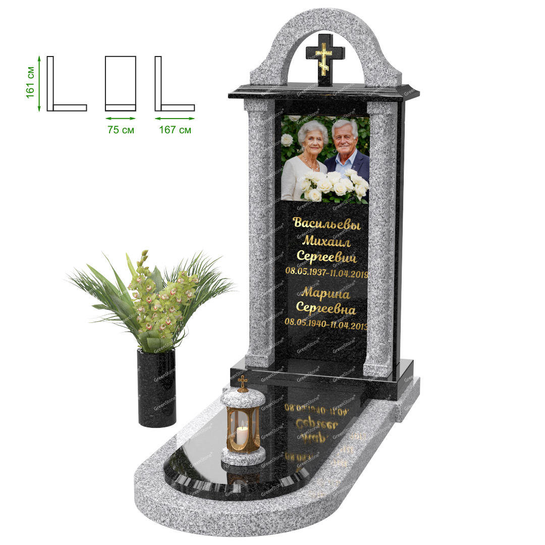 Визуально комплекс отличается от типовой формы не только формой, но и размерами. Массивная стела позволяет дизайнеру реализовать практически любые задумки и пожелания Заказчика, придать готовому изделию солидный вид, раскрыть все достоинства использованного в его изготовлении гранита. Такой габаритный памятник требует профессиональной доставки и установки. Все это также можно заказать в мастерской Грин-Стоун.