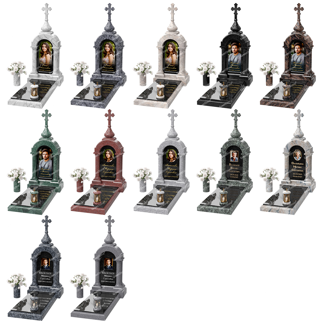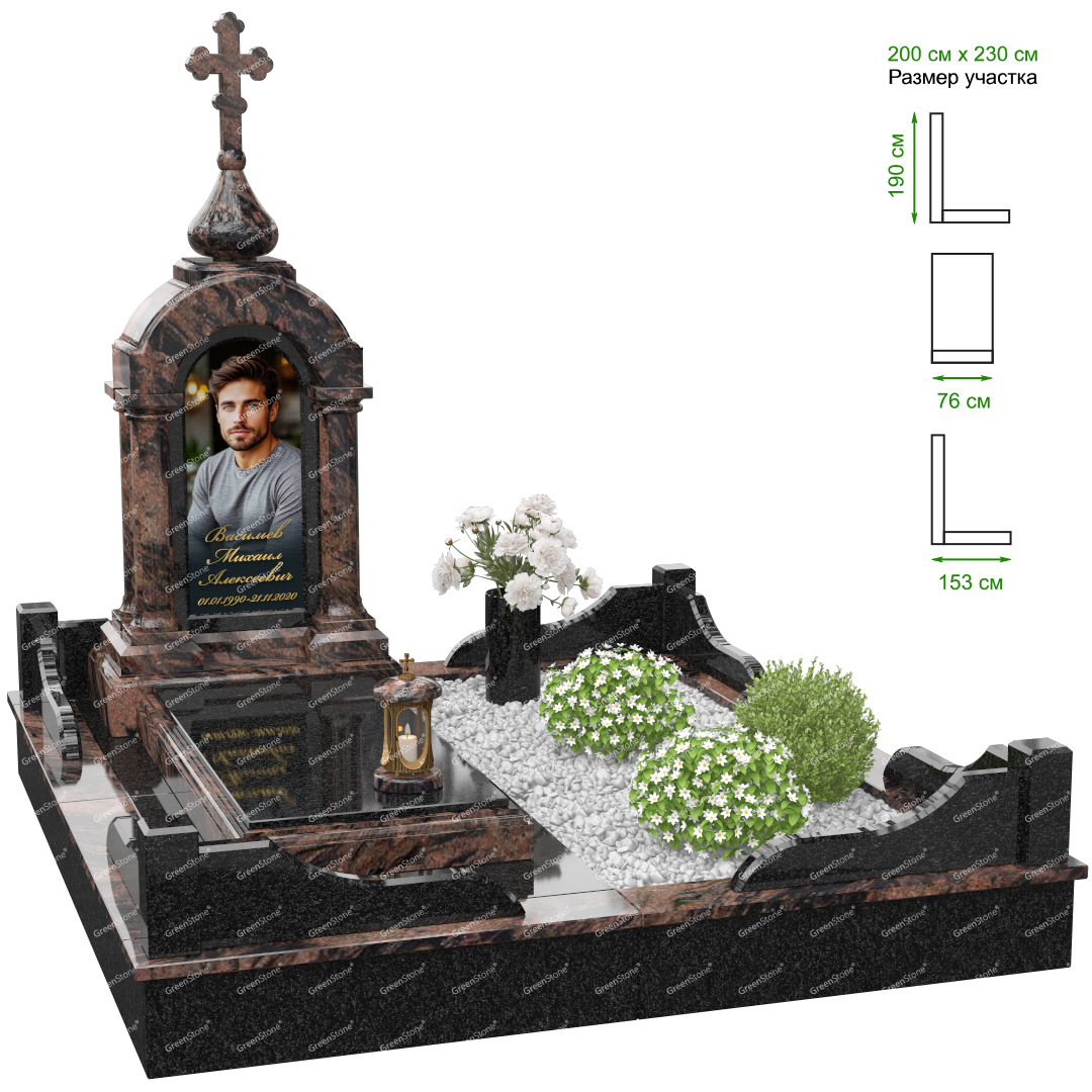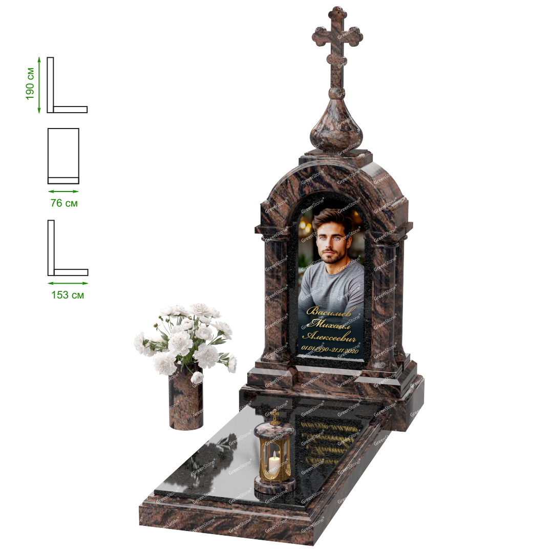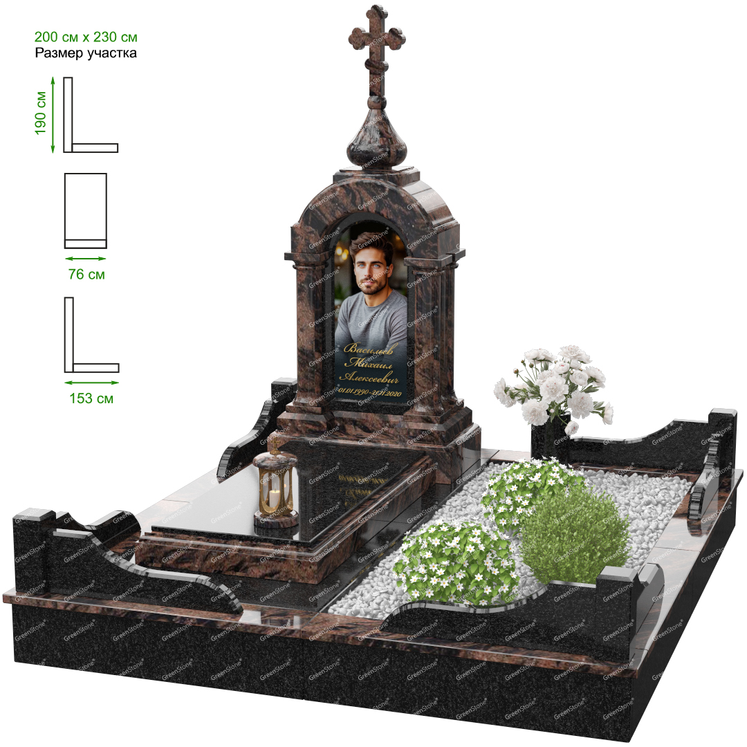 Визуально комплекс отличается от типовой формы не только формой, но и размерами. Массивная стела позволяет дизайнеру реализовать практически любые задумки и пожелания Заказчика, придать готовому изделию солидный вид, раскрыть все достоинства использованного в его изготовлении гранита. Такой габаритный памятник требует профессиональной доставки и установки. Все это также можно заказать в мастерской Грин-Стоун.