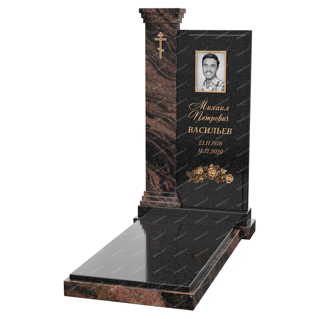 Визуально комплекс отличается от типовой формы не только формой, но и размерами. Массивная стела позволяет дизайнеру реализовать практически любые задумки и пожелания Заказчика, придать готовому изделию солидный вид, раскрыть все достоинства использованного в его изготовлении гранита. Такой габаритный памятник требует профессиональной доставки и установки. Все это также можно заказать в мастерской Грин-Стоун.