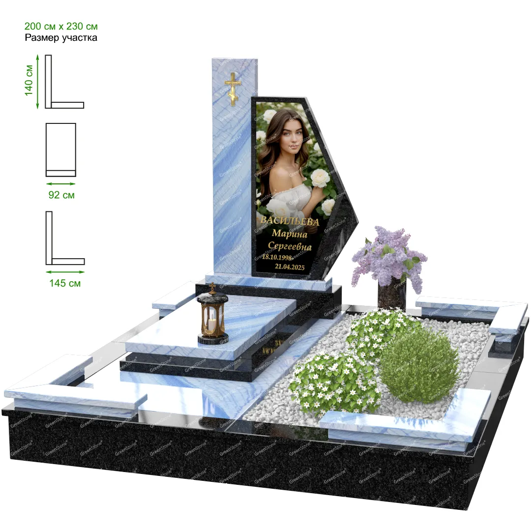 Визуально комплекс отличается от типовой формы не только формой, но и размерами. Массивная стела позволяет дизайнеру реализовать практически любые задумки и пожелания Заказчика, придать готовому изделию солидный вид, раскрыть все достоинства использованного в его изготовлении гранита. Такой габаритный памятник требует профессиональной доставки и установки. Все это также можно заказать в мастерской Грин-Стоун.