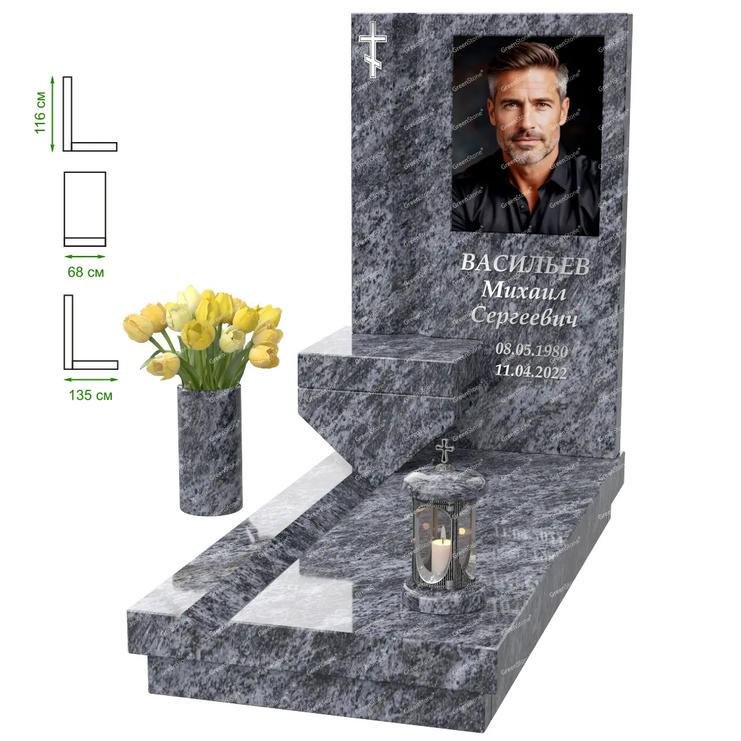Визуально комплекс отличается от типовой формы не только формой, но и размерами. Массивная стела позволяет дизайнеру реализовать практически любые задумки и пожелания Заказчика, придать готовому изделию солидный вид, раскрыть все достоинства использованного в его изготовлении гранита. Такой габаритный памятник требует профессиональной доставки и установки. Все это также можно заказать в мастерской Грин-Стоун.