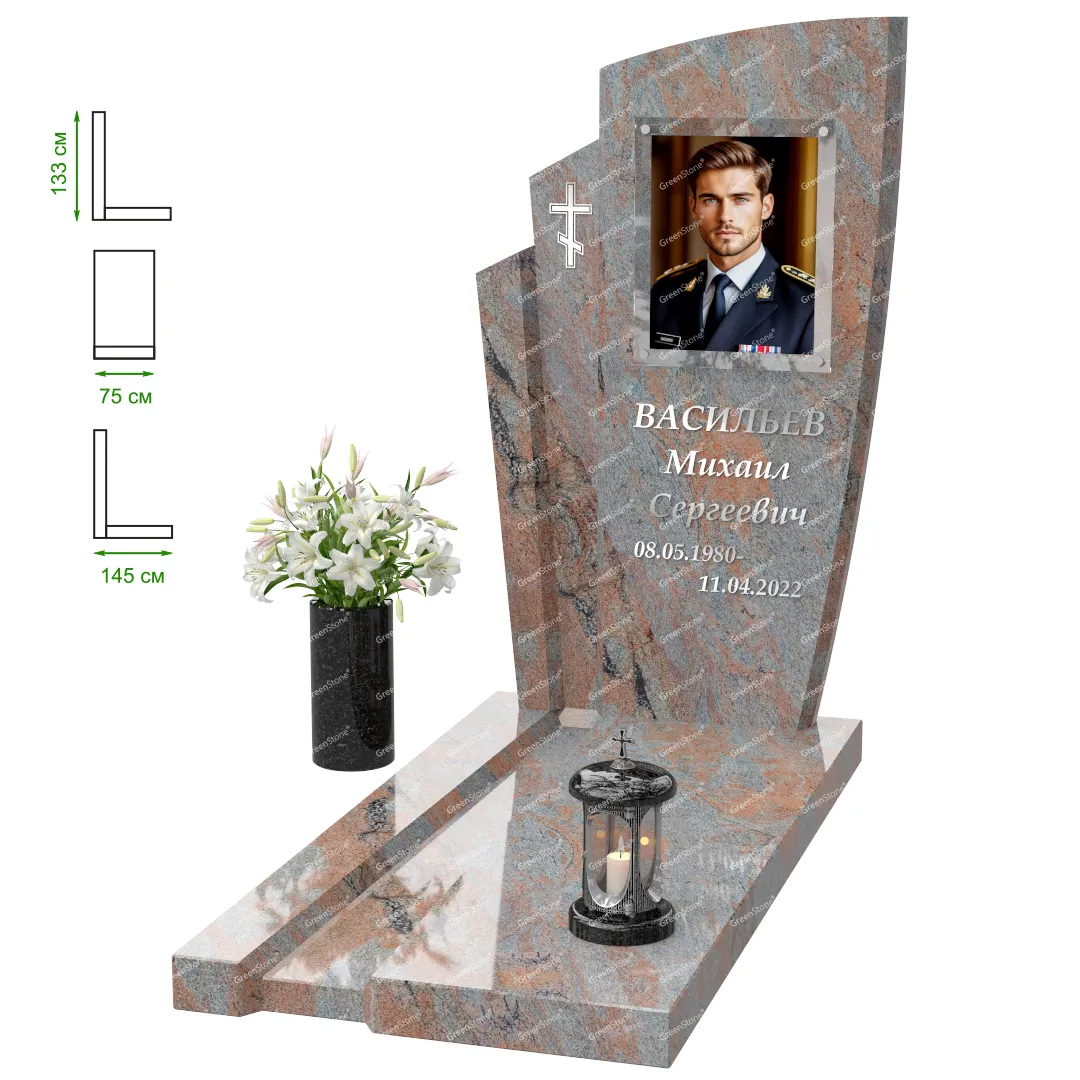 Визуально комплекс отличается от типовой формы не только формой, но и размерами. Массивная стела позволяет дизайнеру реализовать практически любые задумки и пожелания Заказчика, придать готовому изделию солидный вид, раскрыть все достоинства использованного в его изготовлении гранита. Такой габаритный памятник требует профессиональной доставки и установки. Все это также можно заказать в мастерской Грин-Стоун.