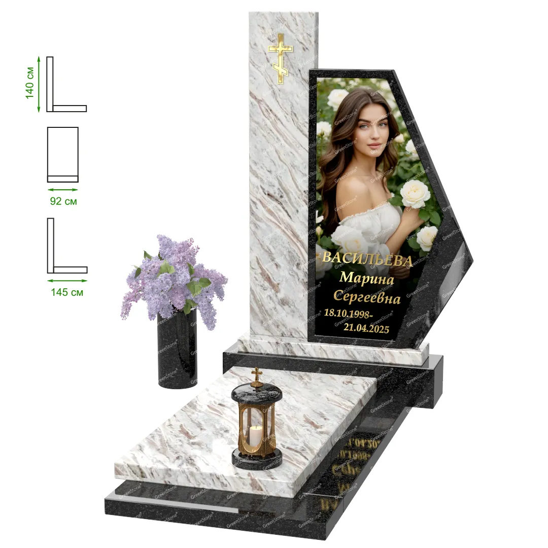 Визуально комплекс отличается от типовой формы не только формой, но и размерами. Массивная стела позволяет дизайнеру реализовать практически любые задумки и пожелания Заказчика, придать готовому изделию солидный вид, раскрыть все достоинства использованного в его изготовлении гранита. Такой габаритный памятник требует профессиональной доставки и установки. Все это также можно заказать в мастерской Грин-Стоун.