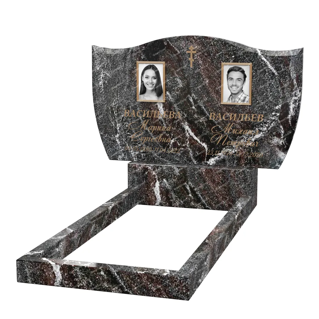 Типовой размер стелы двойного памятника составляет 60×100×5см., однако мы готовы изготовить его в соответствии с любым размером по желанию Заказчика. Цветовое исполнение также не ограничивается традиционным черным цветом. Это может быть гранит Гранатовый амфиболит (Россия), как в данном исполнении, или любой другой из более чем 20 сортов гранита, который вызовет у Вас только самые положительные эмоции.
