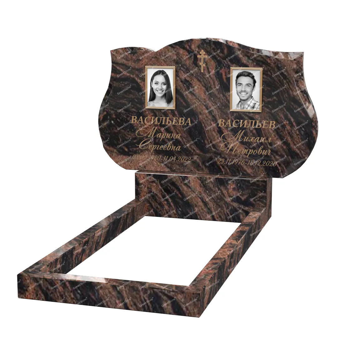 Типовой размер стелы двойного памятника составляет 60×100×5см., однако мы готовы изготовить его в соответствии с любым размером по желанию Заказчика. Цветовое исполнение также не ограничивается традиционным черным цветом. Это может быть гранит Indian Aurora (Индия), как в данном исполнении, или любой другой из более чем 20 сортов гранита, который вызовет у Вас только самые положительные эмоции.