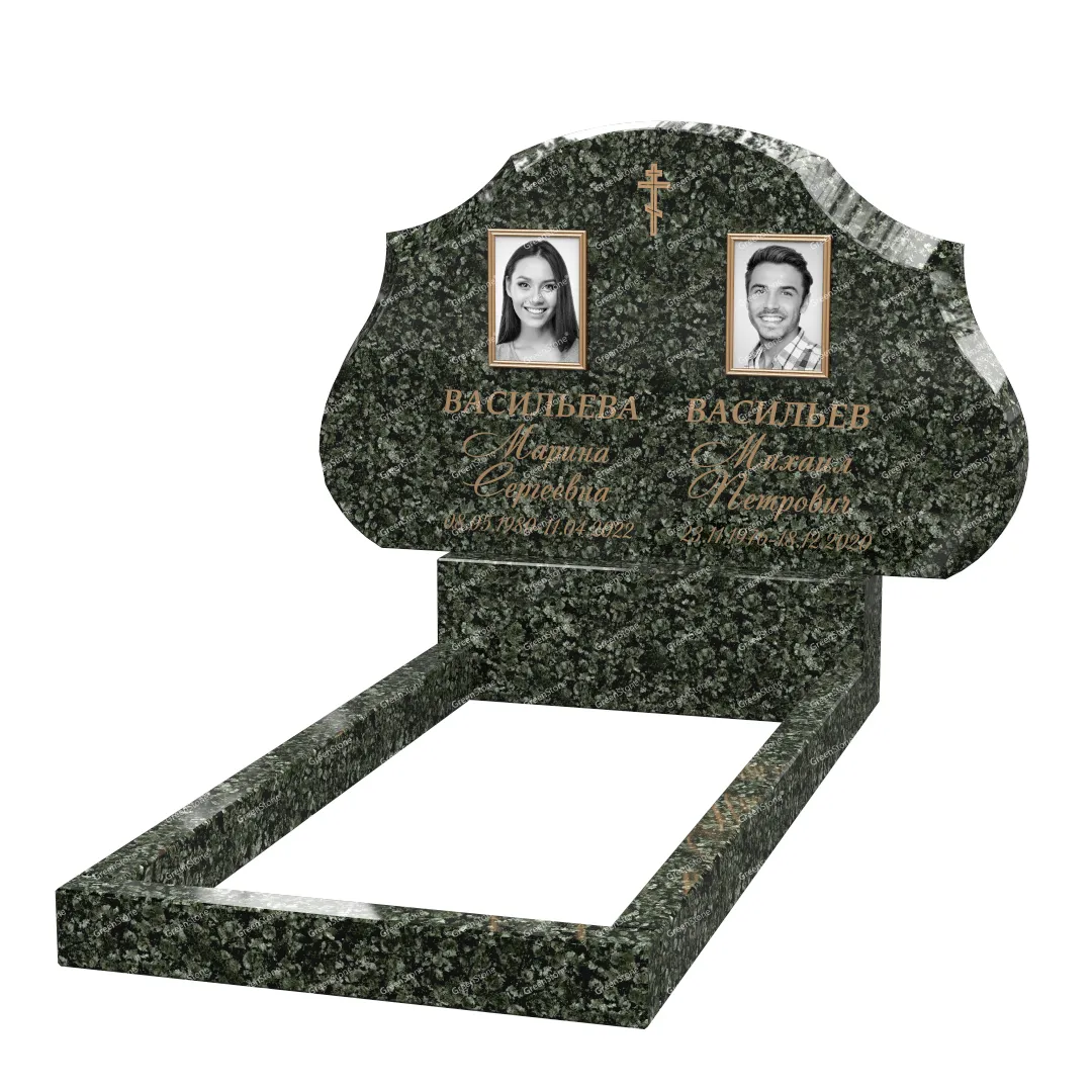 Типовой размер стелы двойного памятника составляет 60×100×5см., однако мы готовы изготовить его в соответствии с любым размером по желанию Заказчика. Цветовое исполнение также не ограничивается традиционным черным цветом. Это может быть гранит Baltic Green (Финляндия), как в данном исполнении, или любой другой из более чем 20 сортов гранита, который вызовет у Вас только самые положительные эмоции.