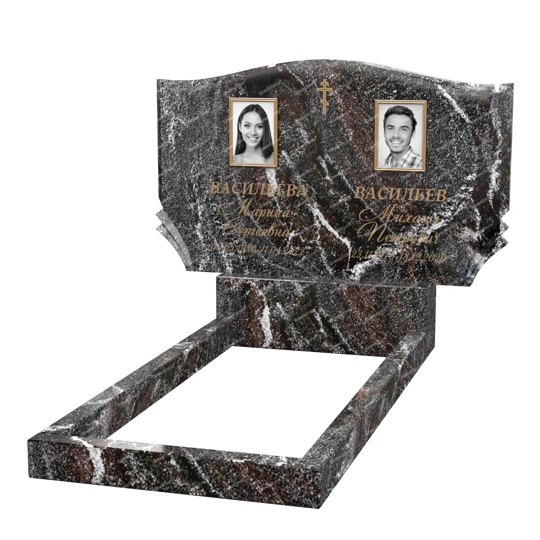 Типовой размер стелы двойного памятника составляет 60×100×5см., однако мы готовы изготовить его в соответствии с любым размером по желанию Заказчика. Цветовое исполнение также не ограничивается традиционным черным цветом. Это может быть гранит Гранатовый амфиболит (Россия), как в данном исполнении, или любой другой из более чем 20 сортов гранита, который вызовет у Вас только самые положительные эмоции.